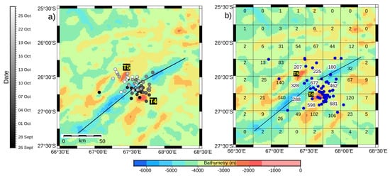 In the case of swarm-2, the events appeared to cluster between two bathymetric highs, T4 and T5, respectively at 26°52′ S, 67°38′ E, and 26°29′ S, 67°21′ E (T5 is NW of T4; Figure 9a and Figure S5b). The mean location of hydroacoustic events per 12 h from 26 September at 00h00 to 27 October at 12h00 (Figure 9a) was primarily concentrated near T4 before 20 October and then concentrated near T5 till the end of the swarm. It also spreads along the NE–SW bathymetric low separating T4 and T5. The spatio-temporal distribution of these averaged locations suggests an episodic cross-feeding of magma between T4 and T5 by a potential dike propagation [,]. It was also observed that the impulsive events were spatially located in the region surrounding T4 and T5 (Figure 9b). They were more clustered near T4 than T5 and, hence, T4 could represent the potential source of magma extrusion or dike initiation (volcanic center). The number of hydroacoustic events per 1/4th degree squares (dashed grid in Figure 9b) shows that 75% of the events were located near T4 and T5 (highlighted in white), a majority of events (2413 out of 4880) near T4, which again shows that it was more active. The decreasing number of events away from the two bathymetric highs supports the idea of a stress readjustment in the surrounding crust []. Moreover, the location of events reported in the ISC catalogue tends to align along a line joining these two seamounts (Figure 2c). This observation together with the focused impulsive events and the event temporal distribution also point for a magmatic origin for swarm-2, initiating with dike propagation from a source near T4.