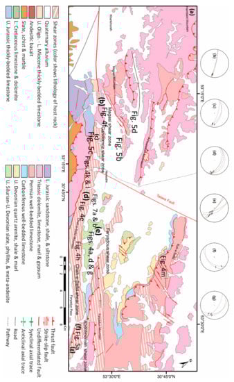 The Zagros orogenic belt consists of a Pan-African metamorphic basement covered by a thick Phanerozoic sequence [10]. The most important stratigraphic units of the Phanerozoic sequence which are exposed in the study area are: (1) Upper Silurian to Upper Devonian slate, phyllite, and meta-andesite; (2) Upper Devonian quartz arenite, shale, and marl; (3) Carboniferous grey, well-bedded, fetid limestone with a Visean quartz arenite unit in the lower part; (4) Permian light to dark grey well-bedded limestone with a distinct lower unit comprising brownish-red sandstone and shale; (5) Triassic dolomite, limestone, marl, and gypsum; (6) Lower Jurassic grey thin-bedded sandstone, shale, and siltstone; (7) Upper Jurassic thick-bedded to massive fetid oolitic limestone and conglomerate; (8) Lower Cretaceous thin- to medium-bedded limestone and dolomite; (9) Upper Oligocene–Lower Miocene thickly-bedded to massive limestone. Among these stratigraphic units, Permian limestone and marble form the most outcrops of the region and most of the shear zones of the study area occur in this unit. The Triassic thickly bedded dark brown dolomite has been metamorphosed to dolomarble up to greenschist facies conditions [14] in the southwestern part of Heneshk. The study area is characterized by different types of faults, completely different duplex structures in terms of size, macroscopic to microscopic fault-related folds [41], and well-developed ductile and brittle–ductile shear zones. The shear zones are intersected by a variety of faults (Figure 3a and Figure 4a), most of which are NE- (hinterland-) dipping thrusts, but there are also some sinistral strike-slip faults in the Faryadoun, Kuh-e-Sefid, Sourmagh, and Abadeh area (Figure 3 and Figure 4) that have displaced rock units up to about 600 m.