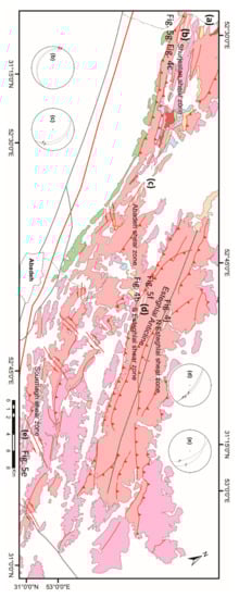 To study the structural characteristics and deformation pattern of the region, after considering the previous geological maps of the study area [51,52,53] and the Quickbird satellite images (Google Earth), several field works were performed in the different parts of the study area. Based on the satellite images and the field data, two simplified geostructural maps were prepared (Figure 3 and Figure 4). During the field studies, important kinematic evidence such as fabrics of the shear zones and shear sense indicators like duplex structures, asymmetric boudins, shear band type fragmented porphyroclasts, mesoscopic asymmetric folds, rotated mantled porphyroclasts and winged inclusions were recorded and analyzed. Several thin sections from the XZ-plane (perpendicular to the foliation and parallel to the lineation) of some of the important oriented samples have been studied under the microscope. Strain fringes and shear band cleavage are the most typical microscopic shear sense indicators that have been studied. The main purpose of considering these structures is to study the sense of flow in the observed shear zones. Because kinematic indicators, such as asymmetric folds and even rotated porphyroclasts, cannot be used as single structures, the fabric elements of the shear zones and many mesoscopic and microscopic shear sense indicators are considered together.