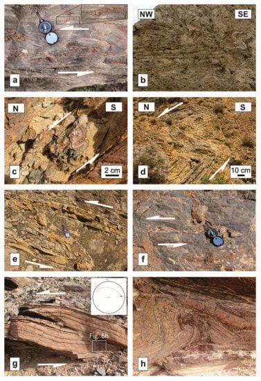 - Simpson, C.; Schmid, S.M. An evaluation of criteria to deduce the sense of movement in sheared rocks. GSA Bull. 1983, 94, 1281–1288. [Google Scholar] [CrossRef]