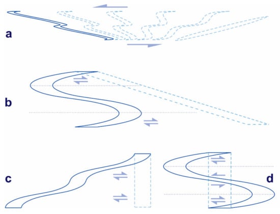 Four different models of folding create asymmetric folds that show opposite vergence of the sense of shear: (a) Increasing strain (to the left in this figure) when the initial layer is at a low angle to axial plane in simple shear folding [81,82]; (b) Initial layer at a low angle to axial plane, heterogeneous simple shear with a constant sense of shear parallel to the axial plane [83]; (c) Initial layer at a right angle to axial plane, asymmetric folds produced by heterogeneous simple shear with a constant sense of shear parallel to the axial plane [79]; (d) Initial layer at a right angle to axial plane, heterogeneous simple shear parallel to axial plane, reversal of shear sense across axial plane [84].