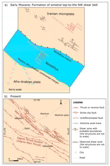 - Ghanbarian, M.A.; Sadeghi Mazidi, M. The effect of dextral Abarkuh Fault on the occurrence of sinistral top-to-the NW de-formation in the Zagros Hinterland Fold-and-Thrust Belt, Iran. In Proceedings of the 3rd TRIGGER International Conference, Trans-Disciplinary Research on Iranian Geology, Geodynamics, Earthquakes and Resources, Zanjan, Iran, 8–10 October 2019. [Google Scholar]