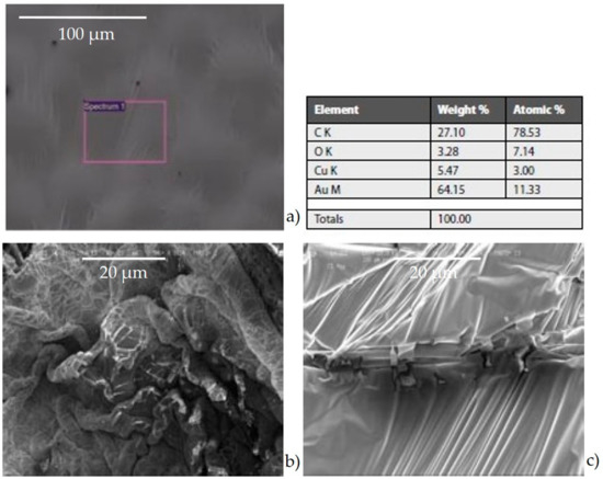 The EDS on the adhesive tape revealed a composition mainly of carbon and oxygen (Figure 3a), as well as the gold obviously used for the cover. The presence of copper could be linked to the metallization which involves the use of a copper disk on which the gold layer was applied. The adhesive tape has proven to be suitable for SEM observations, but it tended to degrade itself with increasing sampling times. Figure 3b,c shows two different examples of evident alterations and bulges on the adhesive tapes, making them unusable for SEM-EDS observations.