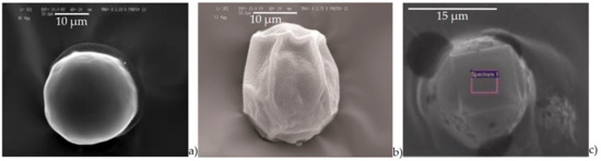 Some example of rounded particles: (a) cenosphere; (b) pollen; (c) NaCl particles growing on a cenosphere.