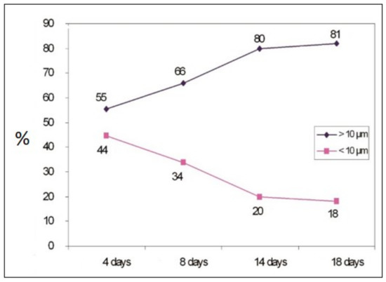 Instead, considering each sampling site, the particles collected revealed that dimensional variations are related to temporal variations. Figure 5 shows the mean values (expressed in percentage) of multiple measurements collected for each sampling period (4, 8, 14, and 18 days). In detail, from the quantitative point of view, an increase in the percentage of the particles with geometric diameters higher than 10 μm with the increasing of time was observed (Figure 5). The presence of particles with diameter >10 μm increased on filters exposed to sampling for a longer time: from 55% of particles, after a 4-day sampling, to 81% of particles, after an 18-day sampling. This could probably be related to a progressive aggregation of the smaller fraction of particulate matter during the time (which in fact decreased with the sampling time), forming larger particles (>10 μm).