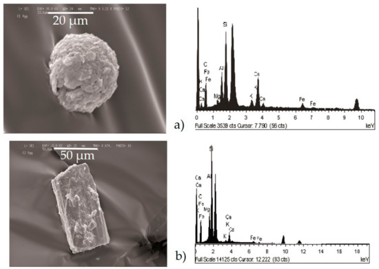 - Agglomerates (Figure 6a) were composed by different kinds of small particles that joined together to form a single particle. The spectrum showed the prevalence of silicates with the high peak of Si, Al, Fe, as well as Mg. The aggregates on the adhesive tapes appeared as a single monodisperse particle: they were not surrounded by other particles, such as those with a small size. This suggested that aggregation occurred directly in the atmosphere and not after being captured by sampling.
