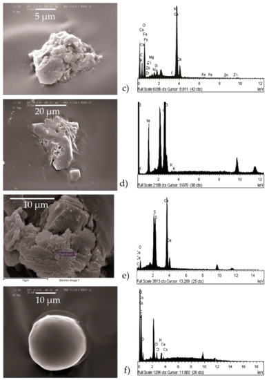 - Carbonates (Figure 6c) showed high peaks in Ca and Mg with impurities of Al, Fe, Cl, alkali (Na, K), and Si. These particles were probably of limestone and/or dolomitic origin. Limestone was distributed as crustal minerals and was widely used in building manufacturing and in metallurgic processes, and dolomite was generally used in metallurgical, chemical, and glass industry, in fertilizers, in ceramics, and as filler in paper and plastic industry. The content of Al, Fe, and Si could be related to impurities present both in dolomites and in limestone. The presence of narrow quantities of Cl and alkali could be explained with the presence of airborne halite particles in the atmosphere.