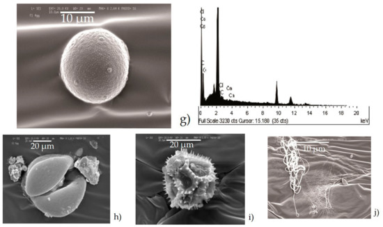 Organic particles were mostly represented by pollens whose spectrum was characterized by C and O high peaks (see Figure 6g). The pollens analyzed belong to the Chenopodiaceae family form walnut (Figure 6g), pine (Figure 6h), and chicory (Figure 6i). Moreover, lichens (Figure 6j), one of the most important sources of natural stone degradation [68,69], were observed.