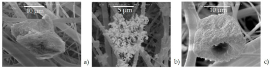 On the Teflon® filters from the station of the Regional Environmental Protection Agency (ARPA Emilia Romagna), it was possible to characterize the particles observed at SEM-EDS as silicate (Figure 7a), carbonate, and C-particles (Figure 7b). Organic particles were also observed, belonging to the Chenopodiaceae family: for example, poplar pollens (Figure 7c).