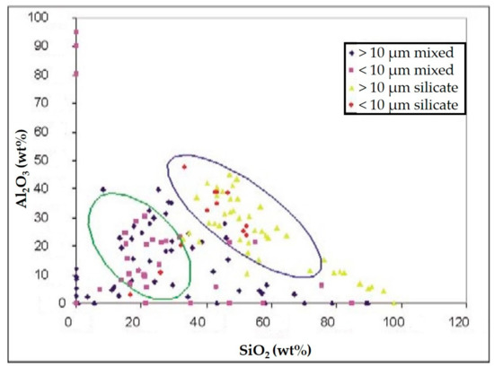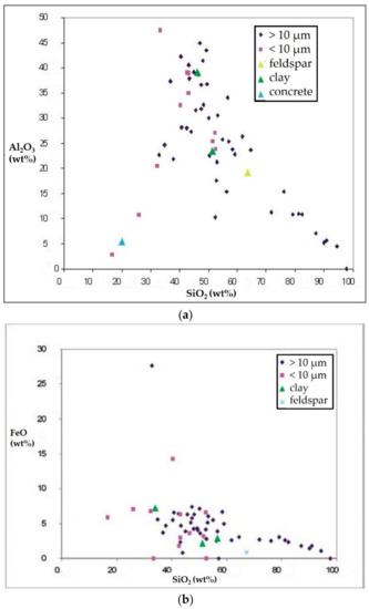 In detail, considering the diagram Al2O3 vs. SiO2 (Figure 9a), the particles show different values of silica oxide (between 0% and 100%) while very low values of aluminum oxide were observed with a maximum of 45 wt%; furthermore, there were no marked compositional differences between particles of different sizes. To verify the relationship between the compositions of the analyzed particles and the common particles from natural contribution, the compositions of clays, alkali-feldspar, and concrete were plotted in the diagram, using the data available in Deer et al. [70], which reports the analyses representative of the common particles from natural contribution. This comparison allowed to verify a significant contribution of natural elements. In particular, the group of particles characterized by a concentration of Al2O3 between 20 and 45 wt% had compositions comparable with those of clay minerals (kaolinite and illite) and alkaline silicates (feldspars), the origin of which could be defined as mainly natural, attributable to the clayey-silty matrix of the soils. However, it should be noted that some particles were characterized by a spherical shape, so they could be related to the combustion product of silicate particles. In addition, particles that deviated from the main trend were: (i) particles with low SiO2 values, generally characterized by spherical shapes that often aggregated on larger carbonaceous particles; and (ii) Al2O3 particles with the composition similar to that of a common cement. It was not a coincidence that these particles were mostly present in the samples collected in the industrial location.