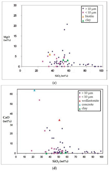 In the diagram CaO vs. SiO2 (Figure 9d), the clay minerals (illite, montmorillonite, and vermiculite) fell into the largest group of particles with CaO values < 10 wt%. Two groups were identified; a first group with trends along the mixing line between concretes and silicates (wollastonite), and a second group closer to the composition of the soils (clays).