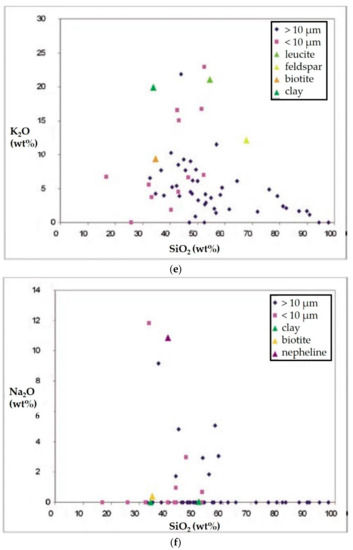 Finally, in the Na2O vs. SiO2 diagram (Figure 9f), all of the analyzed particles showed very low Na2O values (equal to or close to zero or below 1 wt%). These concentrations were comparable with those of common clay minerals (illite and vermiculite) and biotite. Moreover, higher values (around 10 wt%) were observed; these concentrations were higher than those that characterize the common natural contribution. In this case, the compositions were comparable with silica under-saturation phases and with nepheline, an uncommon mineral, which is not present in the sediments of the Po Valley.