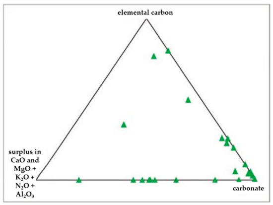 Ternary diagram between elemental carbon, carbonates, and major oxides (surplus in CaO, MgO, K2O, Na2O, and Al2O3), expressed as weight oxide percentage (wt%).
