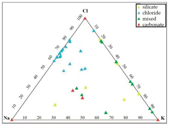 Ternary diagram between chlorine (Cl), sodium (Na), and potassium (K), expressed as weight percentage (wt%), in which silicate, chloride, carbonate, and mixed particles were observed.