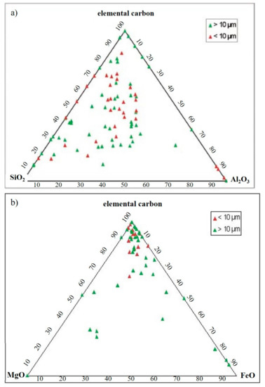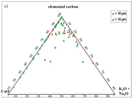 The influence of carbon in the mixed particles was observed through the ternary diagrams of Figure 13, in which the particles were discriminated in relation to size (> 10 μm and <10 μm). The elemental C-SiO2-Al2O3 diagram (Figure 13a) shows a similar distribution of the two types of particles: both were composed mainly of SiO2 and elemental C, with a low value of Al2O3. Many particles deviated from the composition of the natural contribution but seemed to approach those of inert materials and such as concrete. In the elemental C-MgO-FeO diagram (Figure 13b), the particles with dimensions less than 10 μm were concentrated in the vertex of the elemental C, while the particles with dimensions greater than 10 μm tended to scatter toward the vertices of MgO and of FeO, while keeping the percentages of these oxides very low. Moreover, in this case, the strong contribution of anthropogenic carbon particles is shown. Finally, in the elemental C-CaO-K2O + Na2O diagram (Figure 13c), a greater concentration in the vertex of the elemental carbon toward the oxides of Ca and alkalis was observed concerning particles with dimensions greater than 10 μm. In particular, it was possible to note the presence of many plotted particles along the elemental C-CaO side, for which C was probably to be considered as oxide; thus, CO2. For particles with intermediate composition, the same assumptions made in the previous cases were applied, i.e., those related to an anthropic source and the formation of aggregates with a carbonaceous core [85,86].