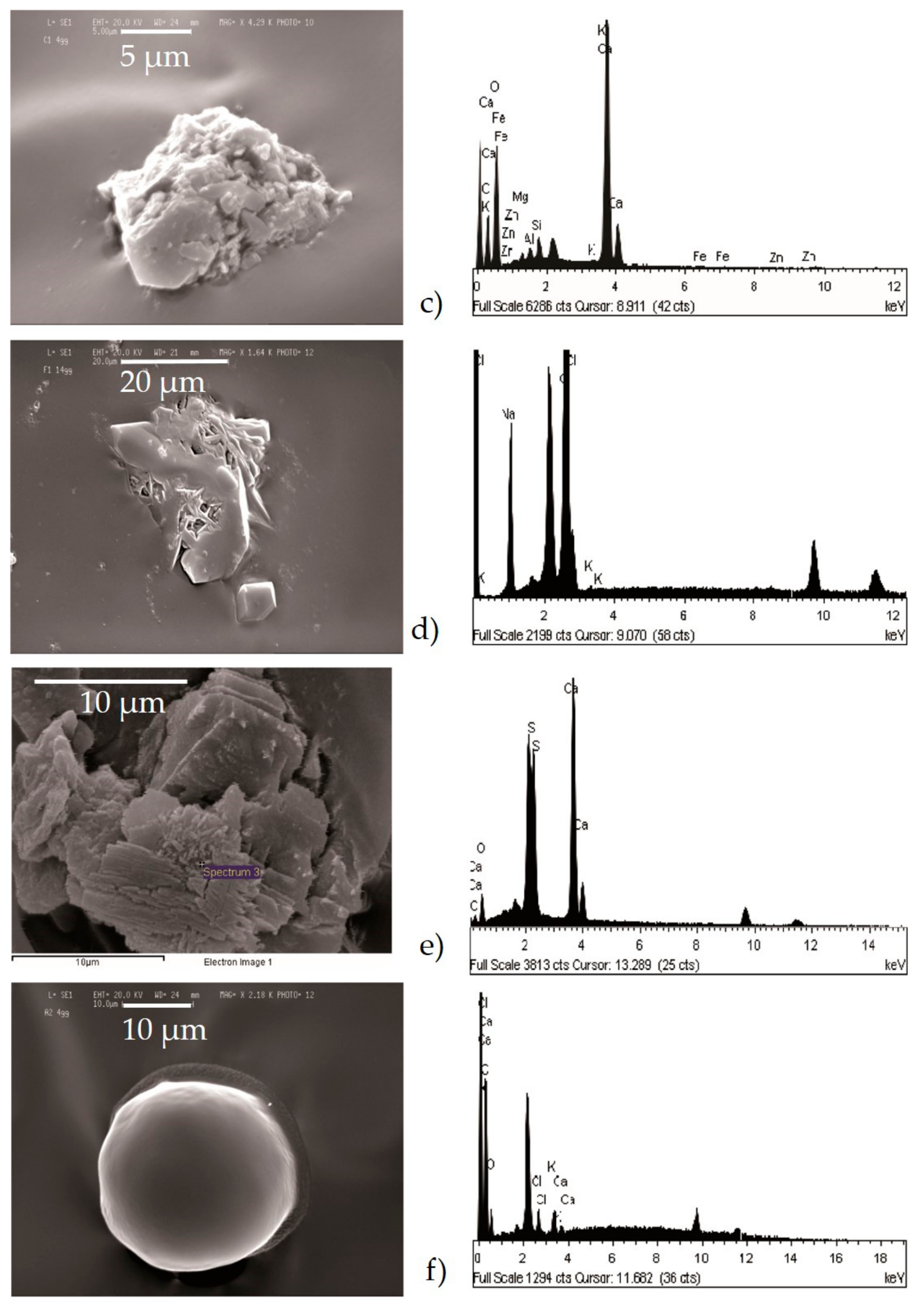 - C-particles (Figure 6f) presented a large size and a rounded shape typical of traffic particles coming from the combustion of oils. The spectrum showed high peaks of C and O and very small Ca, Cl, and alkali peaks, which was probably related to the impurities present in the atmosphere.