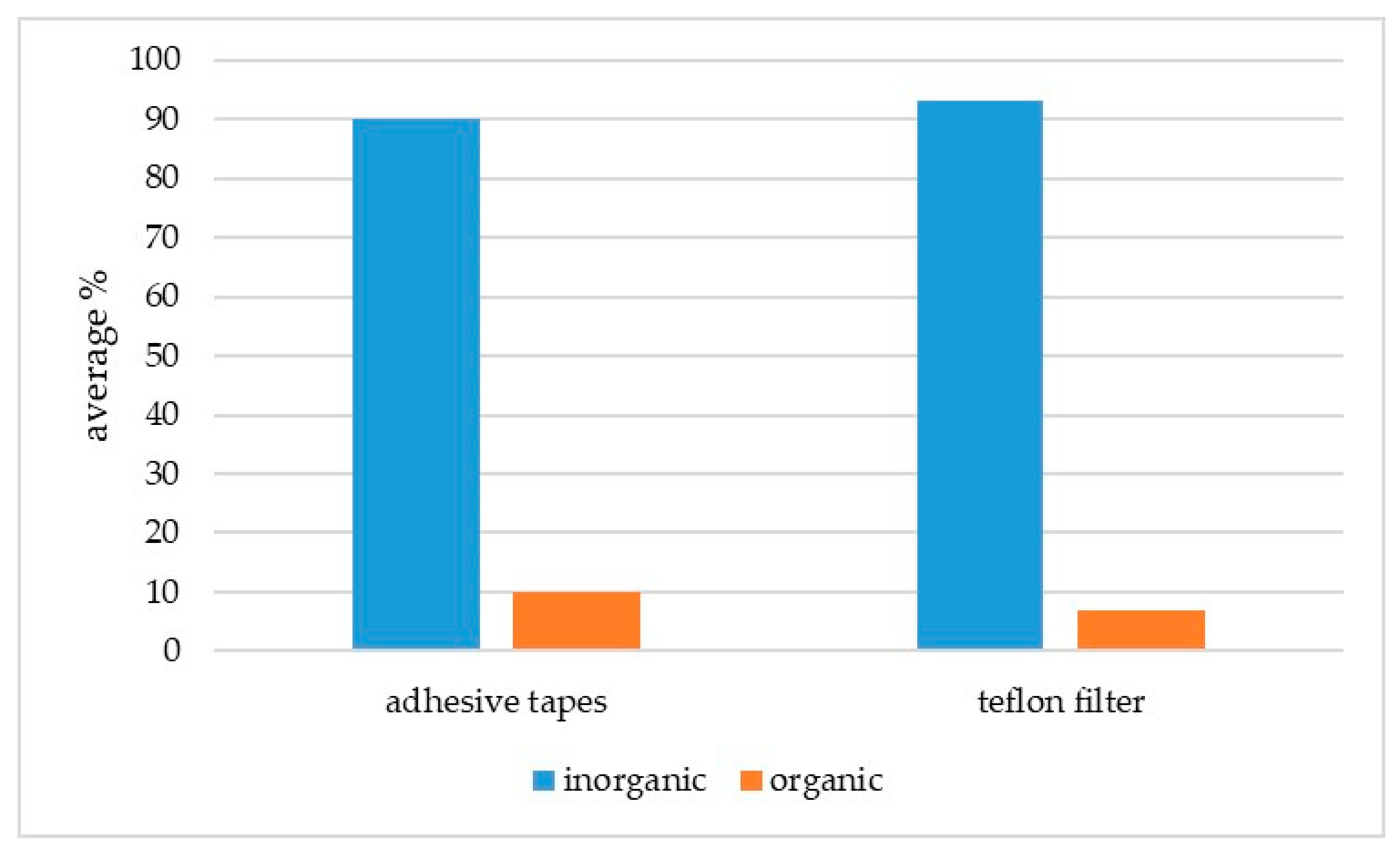 - Chlorides (Figure 6d) showed a high value of Cl and Na, and K was also present. Generally, these kinds of particles are natural particles originating from marine aerosol; however, knowing the sampling area, which is rich in industrial activity, they were probably related to the fertilizer industry.