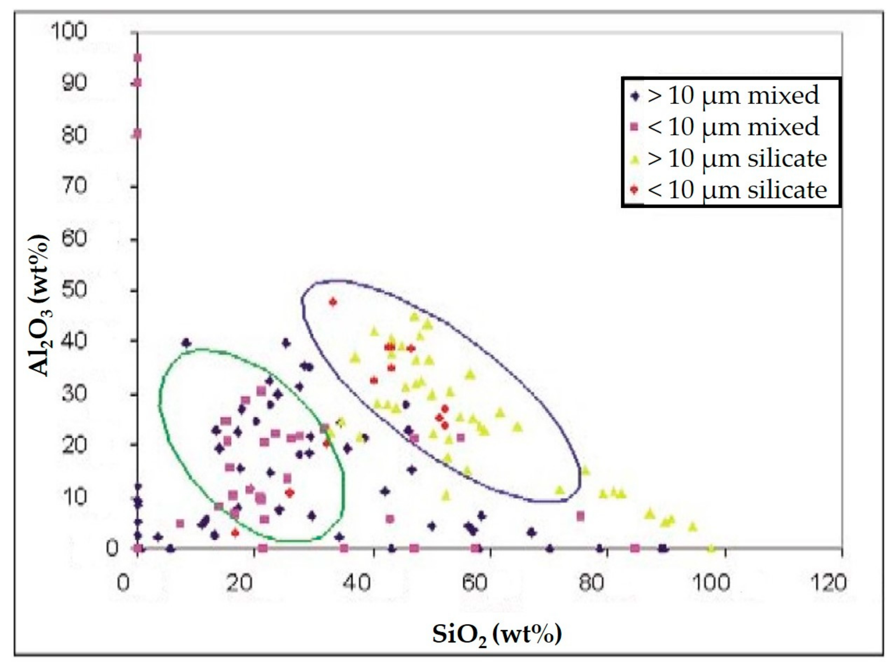 - Moreno, T.; Gibbons, W.; Jones, T.; Richards, R. The geology of ambient aerosols: Characterising urban and rural/coastal silicate PM10–2.5 and PM2.5 using high-volume cascade collection and scanning electron microscopy. Atmos. Environ. 2003, 37, 4265–4276. [Google Scholar] [CrossRef]
