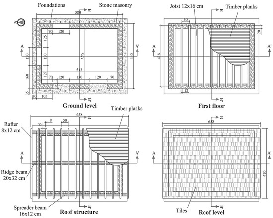 - Mouzakis, C.; Adami, C.-E.; Karapitta, L.; Vintzileou, E. Seismic behaviour of timber-laced stone masonry buildings before and after interventions: Shaking table tests on a two-storey masonry model. Bull. Earthq. Eng. 2017, 16, 803–829. [Google Scholar] [CrossRef]