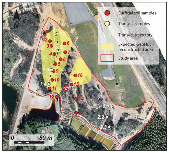 Geochemical characterization of soil samples collected from the two transects (surficial and deep soil samples).