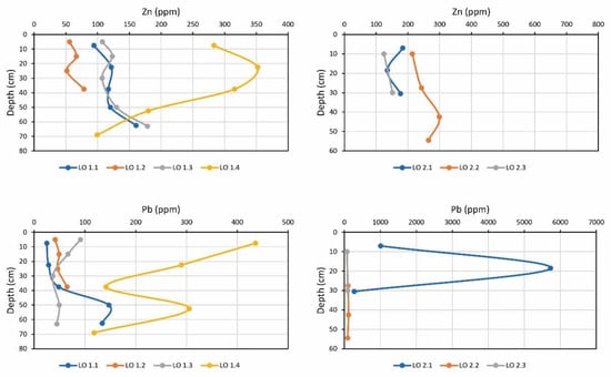 The concentration of Pb was strongly anomalous in the lowest section of transect W and in the upper samples in transect E, showing strongly fluctuating values (Figure 3). This element appeared to be concentrated near the surface, although the highest obtained value (5730 mg·kg−1) corresponded to a depth of approximately 20 cm in the samples located at the upper section of transect E. Although Pb content was generally low for most of the collected samples, it is worth noting that, similarly to the Zn content, Pb concentration appeared to be lower in samples collected at ridge positions in the slope (LO1.1 and LO1.2 in transect W, and LO2.3 in transect E), while generally higher values of Pb appeared in sediment samples collected from the ephemeral channels.