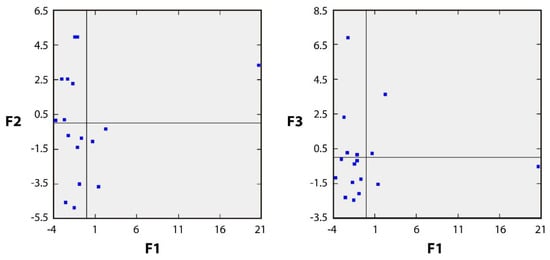 Figure 5 shows the score plots for F2–F1 and F3–F1. In the first case, samples with relative low quartz content plotted above the Y-axis (F2). Only a few of the analyzed samples (LOS1, LOS2, LOS3, and LOS17) showed relative high values of trace elements and mineral phases associated with AMD (Fe2O3, SO3, Pb, As, and jarosite/plumbojarosite) in comparison to the host rock phases (feldspars, SiO2–quartz). In the score plot for F3–F1, most of the samples plotted in the lower left margin of the graphic, which exemplified a low soluble sulfate content (alunite, gypsum, and jarosite/plumbojarosite), in agreement with the results obtained from the mineralogical characterization of the soil samples.
