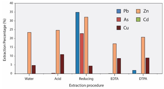 Single-step extraction procedures enable for a rapid evaluation of the PTEs associated with a specific fraction in soil materials. Single-step extraction methods provide less detailed information about the different metal–solid phase association than sequential extraction procedures. However, single-step extraction methods can still give useful information about PTE behavior, when different environmental conditions are simulated (i.e., acidic, alkaline, oxidizing, or reducing conditions) by the selected single reagent or by a mixture of them. Their application is relatively simpler and quicker than sequential extraction procedures due to minor sample handling [28]. These extraction techniques were chosen in this study to obtain comparative information about the mobility of the PTEs in a catalog of different possible leaching conditions in the study area. Thus, it was intended to obtain specific information on leachability, availability, and (bio)availability rather than carrying out an indirect speciation of the PTEs.