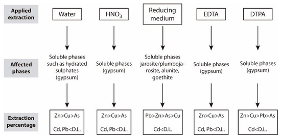 Regarding the extraction percentage results, Zn showed the highest mobilization percentage, with 24.7% of total Zn content, followed by Cu, with a mean value of 10.9%. The results showed that, under acidic conditions, As was expected to be almost immobile, with an average extraction percentage of 0.29%. The extraction percentages of Pb and Cd could not be estimated, due to the lack of precisely quantified values.