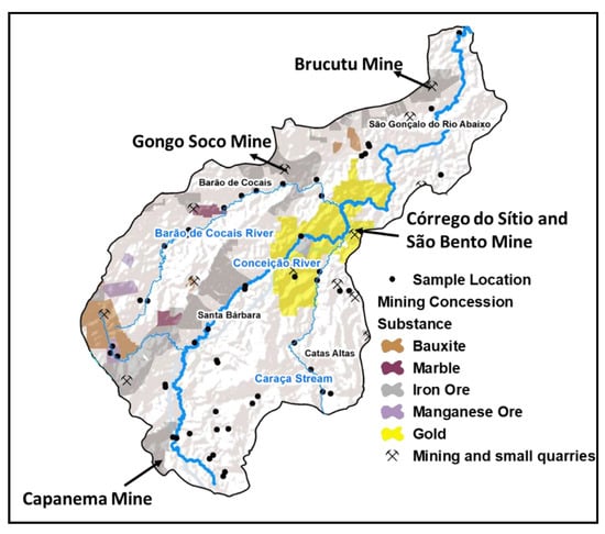 Location of mining concession areas for bauxite, marble, iron, manganese, and gold [22], and main mining activities of the Conceição river basin.