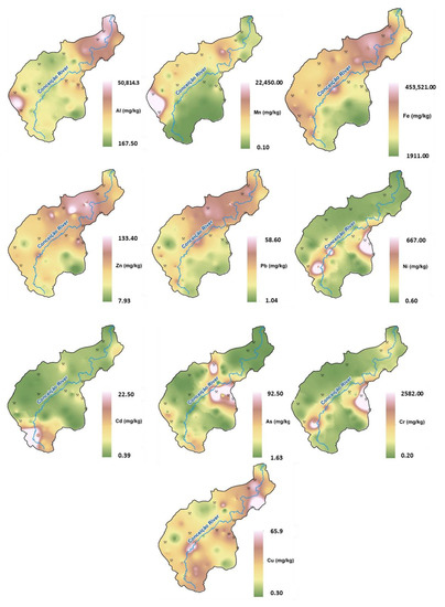 Spatially, metal concentrations have different distributions (Figure 3). Arsenic, Cr and Ni show higher levels in the central and southwest areas where gold mining activities are located close to rural communities; the highest Fe, Mn, and Pb concentrations are observed throughout the upper basin, where the major Fe mining activities of the region are concentrated. The wide distribution of Cu and Zn throughout the basin area and Cd concentration in the extreme southern portion are also observed.