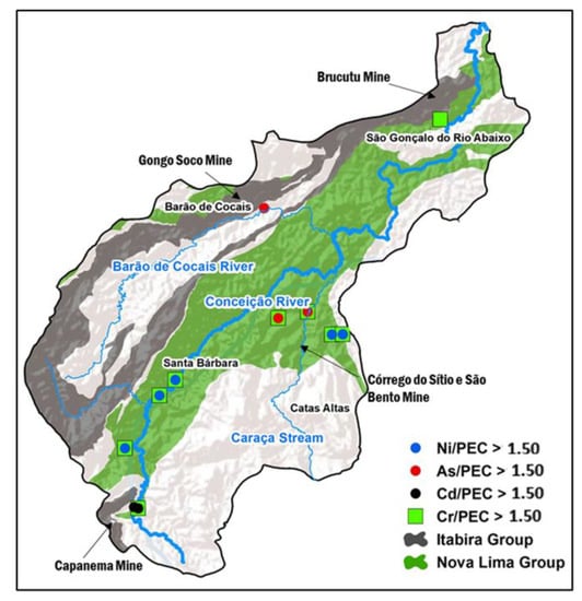In general, the combination of multivariate statistical analysis and sediment contamination, pollution, and quality assessment indexes allowed the distinction of three elementary groups: Fe, Pb, Mn, and Zn (PC1), Ni, Cr, Cu and As (PC2) and Cd (PC3). The first group is mainly related to the Minas Supergroup lithologies, with the occurrence of Fe and Mn mineral deposits, eventually observing Pb and Zn as traces, of which the presence of iron mining increases the concentrations; the second is explained by the metavolcanic rocks of the Rio das Velhas Supergroup, which present Ni, Cr, and Cu as characteristic elements, and As as a trace element related to hydrothermal gold deposits. Finally, Cd has a wide distribution in the basin not associated with a specific lithostratigraphic unit.