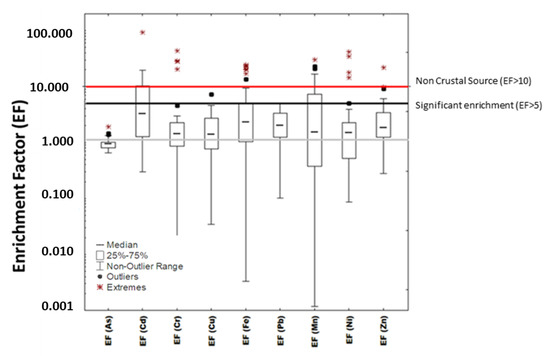 Enrichment factors can provide tools to differentiate an anthropogenic source from a natural process. The EF values close to 1 indicate the crustal source, whereas values greater than 10 are related to anthropogenic sources and processes [39]. In addition, the EF can also assist in determining the degree of metal contamination [40,41], as shows Table 6.