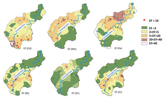 The distribution of the EFs of elements is shown in Figure 5 and Figure 6. In general, the mean EF values are ranked as follows: (Cd) > EF (Fe) > EF (Mn) > EF (Cr) > EF (Ni) > EF (Zn) > EF (Pb) > EF (Cu) > EF (As) (Table 6). In this same context, some authors suggest that EF values greater than 10 are related to no crustal sources [46,54,55]. These values are observed for Cd in approximately 27.5% of samples, and are located in the southern portion of the basin (Figure 6), with an average value of 7.36 and a maximum value of 94.2. For Ni and Cr, EF > 10 is observed for 8% of samples at the same sampling sites, with maximum values of 41.81 and 44.01, respectively. Manganese and Fe had EF > 10 in about 16% of samples with very similar spatial distribution, especially in the mid-northern part of the study area (Figure 5). Although As, Cu, and Pb do not have EF values > 10, some authors suggest that EF values greater than 1.5 indicate the contribution, although small, of non-crustal, or non-weathering materials as a source of these elements [46], which is observed in Figure 5 and Table 6.