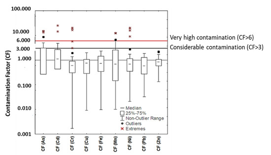 The CF values were interpreted as follows: CF <1 indicates low contamination; 1 < CF < 3 moderate contamination; 3 < CF < 6 considerable contamination; and CF > 6 very high contamination [12].