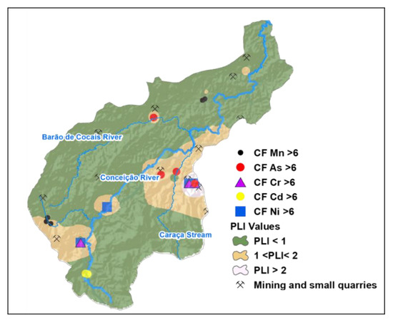 The pollution load index (PLI) was also calculated as a function of metals discussed above, indicating that 14 of the 51 analyzed have some type of pollution. The PLI interpolation (Figure 8) shows the distribution of pollution, representing about 27% of the Conceição river basin area. The central region of the basin, where the Córrego do Sítio and São Bento gold mining are concentrated, showed the largest polluted area. Other zones classified as polluted are found in the southern portion, near Capanema mine and in the northern region, close to the Brucutu and Gongo Soco mines.