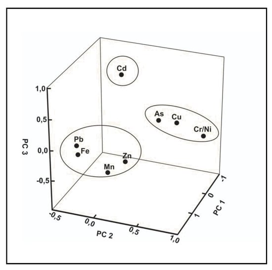 The possible anthropogenic and/or detrital sources of heavy metals in sediments of the Conceição river basin were explored by combining the spatial distribution patterns of metals with multivariate statistical results. The PCA reduced the number of variables to three principal components (PCs) (Table 7, Figure 10), which explain 67.365% of the data. PC1 explains 29.54% of the data and is largely dominated by Fe, Mn, Pb, and Zn. PC 2 is governed by Ni, Cu, and Cr, explaining 25.21% of data variations, with it being possible to associate element As with this factor as well. PC 3 is mainly dominated by Cd and explains 12.609% of data variation.