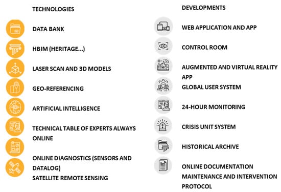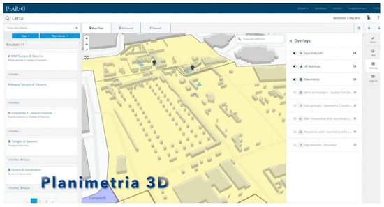 In addition to these, there is a construction site information sheet showing the work in progress, which allows for controlled management of the maintenance work. Each piece of information is interrelated and interfaced with basic cartography consisting of an archaeological map that can also be viewed in 3D for more intuitive management of the information (Figure 5).