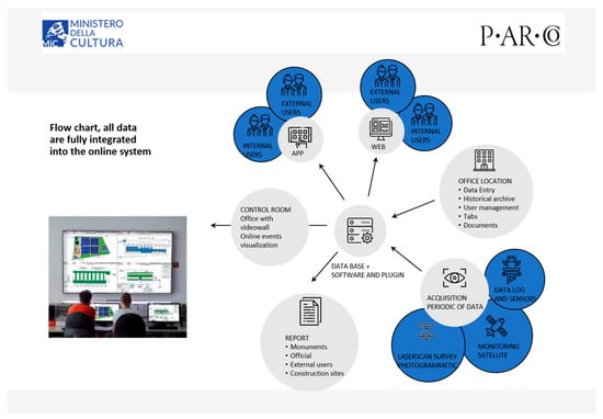 The WebAPP platform is equipped with software capable of integrating terrestrial and satellite measurement systems with analysis methods for the simultaneous processing of different data and ICT, AI, IoT and Earth observation technologies aimed at the safeguarding and structural safety of the cultural heritage. In this way, it constitutes an intuitive and easy-to-use archaeological heritage management tool that reports to the monitoring laboratory established in the archaeological park and equipped with a computer centre specifically designed and dedicated for this purpose (Figure 3).