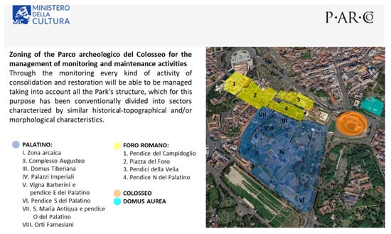 - Russo, A.; Della Giovampaola, I. Il monitoraggio e la manutenzione delle aree archeologiche: Il piano per il futuro del Parco archeologico del Colosseo. In Monitoraggio e Manutenzione delle Aree Archeologiche. Cambiamenti Climatici, Dissesto Idrogeologico, Degrado Chimico-Ambientale, Proceedings of the Atti del Convegno Internazionale di Studi, Roma, Italy, 20–21 March 2019; Russo, A., Della Giovampaola, I., Eds.; (Bibliotheca Archaeologica 65); L’Erma di Bretschneider: Rome, Italy, 2020; pp. 13–31. [Google Scholar]