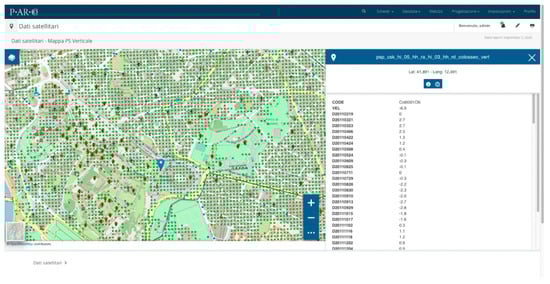 These constitute the different layers on which the Permanent Scatterers (PS) can be superimposed (Figure 6). PS are pointwise measurement points corresponding to objects on the ground (i.e., buildings, archaeological ruins, columns, scattered architectural elements [12]) that are extracted from interferometric processing of long time series of Syntethic Aperture Radar (SAR) images collected from space and provide information on deformation processes over time. As such, the PS layer is essential to investigating the structural stability of the archaeological monuments of the Parco and warning about potential conservation issues. The technique has been successfully tested over Rome in past years [13] and is increasingly used in UNESCO sites [14]. PS included in SyPEAH were produced from the European Space Agency (ESA)’s high-resolution Sentinel-1 constellation and very high-resolution Italian Space Agency (ASI)’s COSMO-SkyMed satellites [15,16].