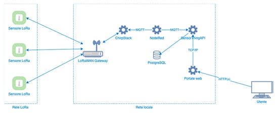The architecture of the system of data collection from sensors (Figure 7) is composed of instruments able to transmit measurements through an ad hoc LoRaWAN network with LoRaWAN gateways able to interact with the software systems on one side and with the sensors on the other, generating notifications on the messages sent by the latter.