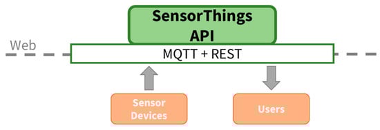 This is managed using open source software: ChirpStack, able to interact with the LoRaWAN gateway within the LoRa network; NodeRed, able to properly manage the sensor messages, converting them into the open format of the OGC (Open Geospatial Consortium) Sensor Things API (Application Programming Interface) standard; SensorThingsAPI (STA), able to store and distribute to the client the measurements generated by the sensors; PostgreSQL, database management system able to store the measurements of the sensors managed by STA; and the web portal interacts via http with STA to display the sensor measurements in a graphical interface via browser. The STA protocol is an open OGC standard for interconnecting devices, data and IoT applications over the web. It provides an MQTT (Message Queuing Telemetry Transport) extension for publish/subscribe models. NodeRed contains many types of pre-installed nodes for parsing text, executing commands, sending and receiving http/UDP/TCP/MQTT (http/Used Data Protocol/Transmission Control Protocol/MQTT) requests, accommodating and cancelling messages, processing CSV files, HTML, JSON and XML messages. Relational and non-relational databases can of course be integrated and used. These protocols are open, expandable and based on the IP communication protocol. Using STA and NodeRed software, the system is configured to interact with any sensor network and to be used with the 5G protocol (Figure 8).