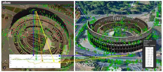 At the Parco, after a brief experience in the central archaeological area of Rome in 2009–2011 [12], a new satellite survey campaign has been carried out [21,22], with the advantage of using archives of radar images that allow the deduction of, in an exhaustive way, the temporal evolution of deformation processes over more than twenty years. The outcome of this campaign, which led to the acquisition of many PS, is still being studied (Figure 6). The satellite data processed in total returned: