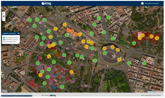 Archaeological sites are affected by changes due to a natural deterioration process over time. If not prevented, this may compromise the functionality of the cultural property, and in turn become pathological and result in degradation. Monitoring through innovative technologies paves the way towards an effective planned maintenance activity and therefore preventive conservation. The monitoring project of the Parco Archeologico del Colosseo was inspired by the desire to build a system of protection and conservation at the service of sustainable exploitation. Established by Ministerial Decree 12 January 2017 in art. 3, the park is an independent cultural site of the Ministry of Culture. It includes the central area of Rome—the Roman Forum, the Palatine, the Colosseum and the Domus Aurea—and has an extension of about 77 hectares, of which about 32 are buildings. With these objectives, the Parco Archeologico del Colosseo has launched a static and dynamic monitoring project consisting of six fundamental levels of activities. The project involves the creation of a multi-parameter system of permanent control of the entire archaeological area, with the associated indicators of the level of risk, for which it is necessary the combined use of innovative technologies.