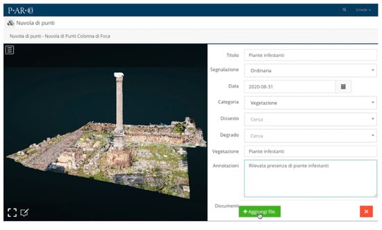 For a correct assessment of the vulnerability and risk of the monument, it is fundamental to know the effects and identify the causes of degradation, a function that cannot be fulfilled only by the expedition cards. As already mentioned, fundamental components of the database are all the information that constitutes the technical register of the monument, i.e., the detailed knowledge of the monumental archaeological heritage. The technical register contains the exact consistency of the physical characteristics (dimensions, materials, etc.), technical characteristics (typology, masonry equipment, etc.), mechanical characteristics, where relevant, and conservation characteristics (degradation, disruption, deformation phenomena, etc.). This information is translated through the tool of infographic modelling known as HBIM [25,26,27].