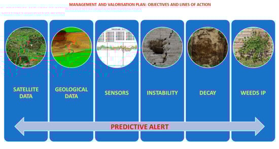 In essence, in order to achieve the predictive evaluation mentioned above, SyPEAH operates through the construction of a system based on algorithms that develop the interrelation between satellite data, geological data, data from ground-based diagnostic instruments, and objective data regarding the consistency of the archaeological heritage, such as instability, degradation, and infesting vegetation (Figure 12). This process generates, when necessary, a predictive alert, which is followed by maintenance work according to the most appropriate methods.