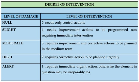 Once a class of damage has been identified with reference to structural instability, degradation, the connection between soil deformation and displacement measurements indicated by satellite data, data from diagnostic instruments interrelated with geological data, and the effects of weed vegetation according to IP/M, the relationship between the severity given by the aforementioned class of damage and the importance of the event recorded in the system given by the aspects involved is able to elaborate an automatic alert that induces immediate intervention (Figure 13).