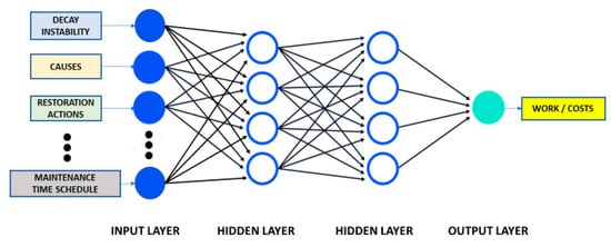 In general, the routine maintenance plan provides for a schedule of checks to be carried out at set intervals. To this end, with the wealth of information that make up the technical registry of archaeological assets, the definition of criticality levels, the identification of a system of vulnerability assessment and predictive alert through a special algorithm, it was planned to “teach” the system to process “autonomously” the actions to be taken to schedule maintenance. In short, it is intended to apply to the system the techniques of Machine Learning, based on the use of artificial neural networks to multiple layers (hidden layers) to process information and a supervised learning model based on regression [37,38,39,40,41]. It should be noted that given the learning time, based on data still being developed and implemented to populate the system, this phase is still being developed and tested. In order not to make the training phase too onerous and complex, it was decided to work with a limited number of weights, i.e., parameters to be learned. The starting point is the interconnection between the state of conservation, criticality, restoration/action/intervention, maintenance, timetable, works/costs. For each type of criticality/deterioration one or more actions or restoration and/or consolidation interventions have been identified; each of these corresponds to a maintenance plan with the relative annual time schedule. Each action/restoration intervention corresponds to one or more items of work with the relative costs from the price list (Figure 14).