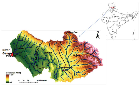 Historic daily runoff data (Q) measured at the Pong Dam (geographical coordinates: 76 05 E and 32 01 N), were made available by the BBMB during the period from 1998 to 2010 (inclusive). Additionally, during the same period, daily P and (Penman–Monteith method) for the Beas river basin up to the Pong Dam were gathered from the Indian Meteorological Department (IMD) and gridded TRMM (TRRM 3B42 V7) daily rainfall data [46]. The spatial resolution of TRMM data is , covering the latitudinal band of 50 N–S. Potential were estimated using the Penman–Monteith (P-M) formulation forced with meteorological variables from the NCEP Climate Forecast System Reanalysis (CFSR) data from January 1999 to December 2008. Based on the elevation, the Beas river basin was divided into three sub-basins, namely upper (), middle (), and lower (), as shown in Figure 1, and the T, , and P data are provided in Table 1. The effect of snowmelt on runoff is important. Beas inflow is also influenced by the snowmelt. Further details on snowmelt runoff for the Beas basin can be found elsewhere [57].