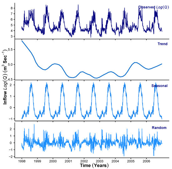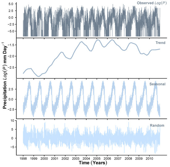 To demonstrate the results obtained at Stage 1 of the HMM_GP framework, Figure 3, Figure 4 and Figure 5 show the STL decomposition for the log of the time series for , P and Q, respectively, during the period from 1998 to 2010. Note that as zero entries may occur in the data for P, before taking logs, we add a very small number () to the P time series. A reverse of this is performed when transforming back from the additive series to the multiplicative series. We set the seasonal decomposition window to a granularity of one year as we wish to investigate the changes on an annual basis. Both and Q show clear annual peaks and troughs, whereas the P, although exhibiting an annual monsoon season, has many days throughout the year when there is either zero or extremely low rainfall. We can see that, in general, the trend for , and exhibit a change in behaviour around the years 2003–2004 where Q shows a change in decreasing trend to increasing trend; P shows levelling off after years of increasing, and starts a downward trend after a few years of a generally unchanging trend. Therefore, we concluded that, in general, as the trend for decreases, we expect an increase in the trend for Q into the reservoir. We also see that as the trend for P increases to its peak in 2006, the trend for Q also rises. Please note that the periods of 2002–2003, 2004–2005, 2006–2007 and 2009–2010 were recorded to observe ENSO events [64].